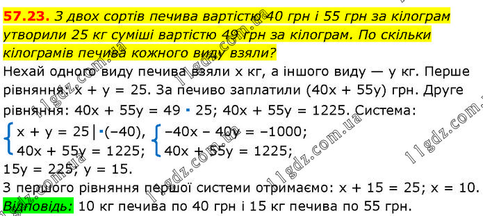 З двох сортів печива вартістю 40 грн і 55 грн за кілограм утворили 25 кг суміші вартістю 49 грн за кілограм. По скільки кілограмів печива кожного виду взяли? Нехай одного виду печива взяли х кг, а іншого виду — у кг. Перше рівняння: х + у = 25. За печиво заплатили (40х + 55у) грн. Друге рівняння: 40х + 55у = 49 ∙ 25; 40х + 55у = 1225. Система: