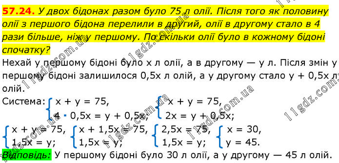 У двох бідонах разом було 75 л олії. Після того як половину олії з першого бідона перелили в другий, олії в другому стало в 4 рази більше, ніж у першому. По скільки олії було в кожному бідоні спочатку? Нехай у першому бідоні було х л олії, а в другому — у л. Після змін у першому бідоні залишилося 0,5х л олій, а у другому стало у + 0,5х л олій.