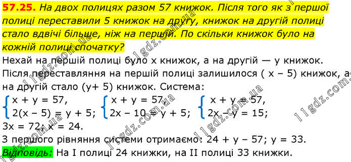 На двох полицях разом 57 книжок. Після того як з першої полиці переставили 5 книжок на другу, книжок на другій полиці стало вдвічі більше, ніж на першій. По скільки книжок було на кожній полиці спочатку? Нехай на першій полиці було х книжок, а на другій — у книжок. Після переставляння на першій полиці залишилося (х – 5) книжок, а на другій стало (у + 5) книжок. Система: