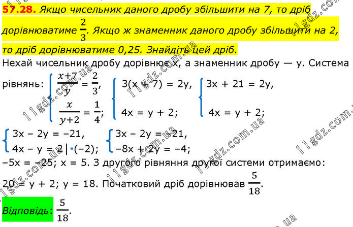 Якщо чисельник даного дробу збільшити на 7, то дріб дорівнюватиме 2/3. Якщо ж знаменник даного дробу збільшити на 2, то дріб дорівнюватиме 0,25. Знайдіть цей дріб. Нехай чисельник дробу дорівнює х, а знаменник дробу — у. Система рівнянь:
