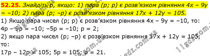 Знайдіть р, якщо: 1) пара (р; р) є розв’язком рівняння 4х – 9у = –10; 2) пара (р; –р) є розв’язком рівняння 17х + 12у = 105. 1) Якщо пара чисел (р; р) є розв’язком рівняння 4х – 9у = –10, то: 4р – 9р = –10; –5р = –10; р = 2; 2) якщо пара чисел (р; –р) є розв’язком рівняння 17х + 12у = 105, то: 17p – 12p = 105; 5p = 105; p = 21.