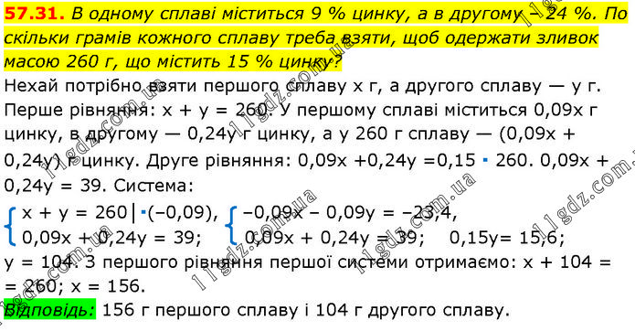 В одному сплаві міститься 9 % цинку, а в другому – 24 %. По скільки грамів кожного сплаву треба взяти, щоб одержати зливок масою 260 г, що містить 15 % цинку? Нехай потрібно взяти першого сплаву х г, а другого сплаву — у г. Перше рівняння: х + у = 260. У першому сплаві міститься 0,09х г цинку, в другому — 0,24у г цинку, а у 260 г сплаву — (0,09х + 0,24у) г цинку. Друге рівняння: 0,09х +0,24у =0,15 ∙ 260. 0,09х + 0,24у = 39. Система: