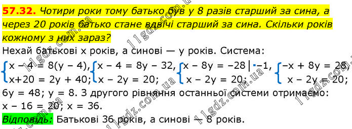 Чотири роки тому батько був у 8 разів старший за сина, а через 20 років батько стане вдвічі старший за сина. Скільки років кожному з них зараз? Нехай батькові х років, а синові — у років. Система: