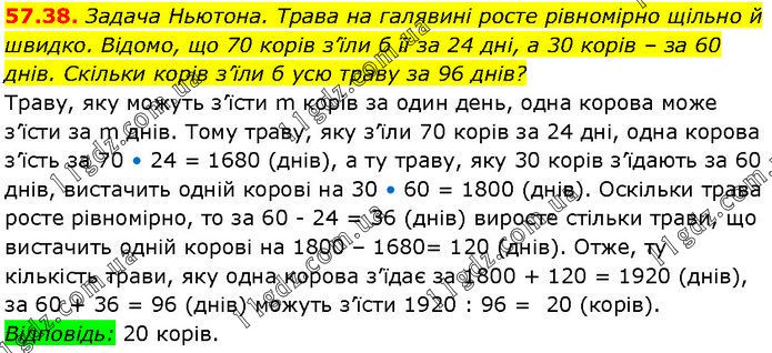 Задача Ньютона. Трава на галявині росте рівномірно щільно й швидко. Відомо, що 70 корів з’їли б її за 24 дні, а 30 корів – за 60 днів. Скільки корів з’їли б усю траву за 96 днів? Траву, яку можуть з’їсти m корів за один день, одна корова може з’їсти за m днів. Тому траву, яку з’їли 70 корів за 24 дні, одна корова з’їсть за 70 • 24 = 1680 (днів), а ту траву, яку 30 корів з’їдають за 60 днів, вистачить одній корові на 30 • 60 = 1800 (днів). Оскільки трава росте рівномірно, то за 60 24 = 36 (днів) виросте стільки трави, що вистачить одній корові на 1800 – 1680= 120 (днів). Отже, ту кількість трави, яку одна корова з’їдає за 1800 + 120 = 1920 (днів), за 60 + 36 = 96 (днів) можуть з’їсти 1920 : 96 = 20 (корів). Відповідь: 20 корів.
