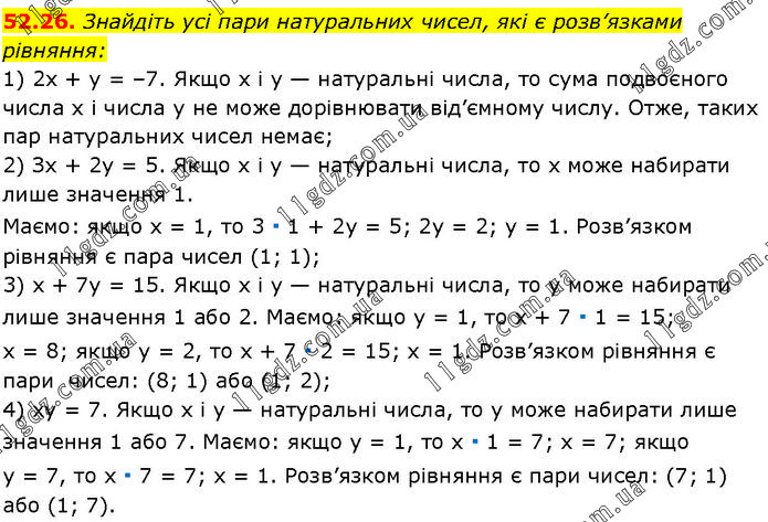 Знайдіть усі пари натуральних чисел, які є розв’язками рівняння: 1) 2х + у = –7. Якщо х і у — натуральні числа, то сума подвоєного числа х і числа у не може дорівнювати від’ємному числу. Отже, таких пар натуральних чисел немає; 2) Зх + 2у = 5. Якщо х і у — натуральні числа, то х може набирати лише значення 1. Маємо: якщо х = 1, то 3 ∙ 1 + 2у = 5; 2у = 2; у = 1. Розв’язком рівняння є пара чисел (1; 1); 3) х + 7y = 15. Якщо х і у — натуральні числа, то у може набирати лише значення 1 або 2. Маємо: якщо у = 1, то х + 7 ∙ 1 = 15; х = 8; якщо у = 2, то х + 7 ∙ 2 = 15; х = 1. Розв’язком рівняння є пари чисел: (8; 1) або (1; 2); 4) ху = 7. Якщо х і у — натуральні числа, то у може набирати лише значення 1 або 7. Маємо: якщо у = 1, то x ∙ 1 = 7; х = 7; якщо у = 7, то х ∙ 7 = 7; х = 1. Розв’язком рівняння є пари чисел: (7; 1) або (1; 7).
