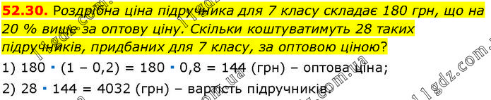 Роздрібна ціна підручника для 7 класу складає 180 грн, що на 20 % вище за оптову ціну. Скільки коштуватимуть 28 таких підручників, придбаних для 7 класу, за оптовою ціною? 1) 180 ∙ (1 – 0,2) = 180 ∙ 0,8 = 144 (грн) – оптова ціна; 2) 28 ∙ 144 = 4032 (грн) – вартість підручників.