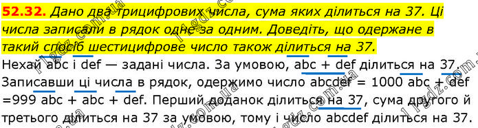 Дано два трицифрових числа, сума яких ділиться на 37. Ці числа записали в рядок одне за одним. Доведіть, що одержане в такий спосіб шестицифрове число також ділиться на 37. Нехай abc і def — задані числа. За умовою, abc + def ділиться на 37. Записавши ці числа в рядок, одержимо число abcdef = 1000 abc + def =999 abc + abc + def. Перший доданок ділиться на 37, сума другого й третього ділиться на 37 за умовою, тому і число abcdef ділиться на 37.