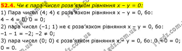 Чи є пара чисел розв’язком рівняння х – у = 0: 1) Пара чисел (4; 4) є розв’язком рівняння х – у = 0, бо: 4 – 4 = 0; 0 = 0; 2) пара чисел (–1; 1) не є розв’язком рівняння х – у = 0, бо: –1 – 1 = –2; –2 ≠ 0; 3) пара чисел (0; 0) є розв’язком рівняння х – y = 0, бо: 0 – 0 = 0; 0 = 0.