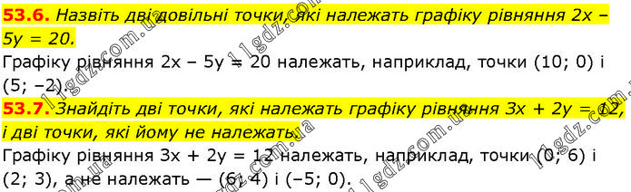 53.6. Назвіть дві довільні точки, які належать графіку рівняння 2х – 5у = 20. Графіку рівняння 2х – 5y = 20 належать, наприклад, точки (10; 0) і (5; –2). 53.7. Знайдіть дві точки, які належать графіку рівняння Зх + 2у = 12, і дві точки, які йому не належать. Графіку рівняння Зх + 2y = 12 належать, наприклад, точки (0; 6) і (2; 3), а не належать — (6; 4) і (–5; 0).