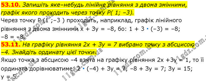53.10. Запишіть яке–небудь лінійне рівняння з двома змінними, графік якого проходить через точку Р( 1; –3). Через точку Р (1 ;–3 ) проходить, наприклад, графік лінійного рівняння з двома змінними х + Зу = –8, бо: 1 + 3 ∙ (–3) = –8; –8 = –8. 53.11. На графіку рівняння 2х + Зу = 7 вибрано точку з абсцисою –4. Знайдіть ординату цієї точки. Якщо точка з абсцисою –4 взята на графіку рівняння 2х +3у = 1, то її ордината дорівнюватиме: 2 ∙ (–4) + Зу = 7; –8 + Зу = 7; Зу = 15; у = 5.