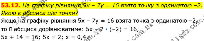 На графіку рівняння 5х – 7y = 16 взято точку з ординатою –2. Якою є абсциса цієї точки? Якщо на графіку рівняння 5x – 7y = 16 взята точка з ординатою –2, то її абсциса дорівнюватиме: 5x – 7 ∙ (–2) = 16; 5x + 14 = 16; 5x = 2; x = 0,4.
