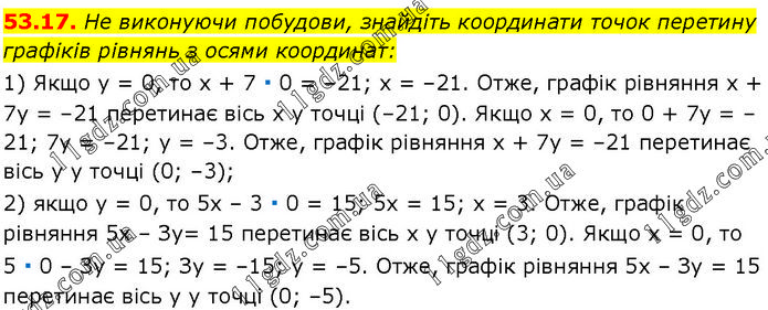 He виконуючи побудови, знайдіть координати точок перетину графіків рівнянь з осями координат: 1) Якщо у = 0, то х + 7 ∙ 0 = –21; х = –21. Отже, графік рівняння х + 7y = –21 перетинає вісь х у точці (–21; 0). Якщо х = 0, то 0 + 7y = –21; 7у = –21; у = –3. Отже, графік рівняння х + 7y = –21 перетинає вісь у у точці (0; –3); 2) якщо у = 0, то 5х – 3 ∙ 0 = 15; 5х = 15; х = 3. Отже, графік рівняння 5х – Зу= 15 перетинає вісь х у точці (3; 0). Якщо х = 0, то 5 ∙ 0 – Зу = 15; Зу = –15; у = –5. Отже, графік рівняння 5х – Зу = 15 перетинає вісь у у точці (0; –5).