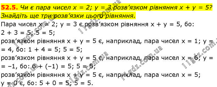Чи є пара чисел х = 2; у = 3 розв’язком рівняння х + у = 5? Знайдіть ще три розв’язки цього рівняння. Пара чисел х = 2; y = 3 є розв’язком рівняння х + y = 5, бо: 2 + 3 = 5; 5 = 5; розв’язком рівняння х + y = 5 є, наприклад, пара чисел х = 1; y = 4, бо: 1 + 4 = 5; 5 = 5; розв’язком рівняння х + у = 5 є, наприклад, пара чисел х = 6; у = –1, бо: 6 + (–1) = 5; 5 = 5; розв’язком рівняння х + y = 5 є, наприклад, пара чисел х = 5; у = 0 є, бо: 5 + 0 = 5; 5 = 5.