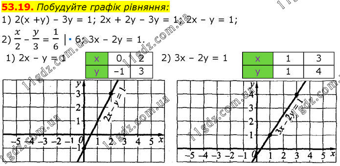 Побудуйте графік рівняння: 1) 2(x +y) – 3y = 1; 2x + 2y – 3y = 1; 2x – y = 1; 2) x/2 – y/3 = 1/6 │∙ 6; 3x – 2y = 1.