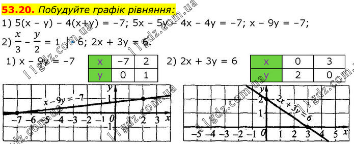 Побудуйте графік рівняння: 1) 5(х – у) – 4(х+у) = –7; 5x – 5у – 4х – 4у = –7; х – 9у = –7; 2) x/3 – y/2 = 1 │∙ 6; 2x + 3y = 6.