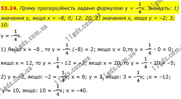Пряму пропорційність задано формулою у = –1/4х. Знайдіть: 1) значення у, якщо х = –8; 0; 12; 20; 2) значення х, якщо у = –2; 3; 10. у = –1/4х. 1) Якщо х = –8 , то у = –1/4∙ (–8) = 2; якщо х = 0,то у = –1/4 ∙ 0 = 0; якщо x = 12, то у = –1/4 ∙ 12 = –3; якщо x = 20, то y = –1/4 ∙ 20 = –5; 2) y = –2, якщо: –2 = –1/4х; х = 8; у = 3, якщо: 3 = –1/4х; ;х = –12; у = 10, якщо: 10 = –1/4x; х = –40.
