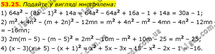 Подайте у вигляді многочлена: 1) 64а2 – (8а – 1)2 + 14а = 64а2 – 64а2 + 16а – 1 + 14а = 30а – 1; 2) m2 + 4n2 – (m + 2n)2 – 12mn = m2 + 4n2 – m2 – 4mn – 4n2 – 12mn = –16mn; 3) 2m(m – 5) – (m – 5)2 = 2m2 – 10m – m2 + 10m – 25 = m2 – 25; 4) (х – 3)(х + 5) – (х + 1)2 = х2 + 5х – Зх – 15 – x2 – 2х – 1 = –16.
