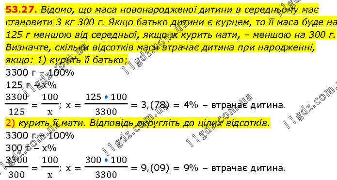 Відомо, що маса новонародженої дитини в середньому має становити 3 кг 300 г. Якщо батько дитини є курцем, то її маса буде на 125 г меншою від середньої, якщо ж курить мати, – меншою на 300 г. Визначте, скільки відсотків маси втрачає дитина при народженні, якщо: 1) курить її батько; 3300 г – 100%; 125 г – х%. 3300/125 = 100/х; х = (125 • 100)/3300 = 3,(78) = 4% – втрачає дитина. 2) курить її мати. Відповідь округліть до цілих відсотків. 3300 г – 100%; 300 г – х%. 3300/300 = 100/х; х = (300 • 100)/3300 = 9,(09)