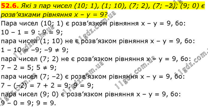 Які з пар чисел (10; 1), (1; 10), (7; 2), (7; –2), (9; 0) є розв’язками рівняння х – у = 9? Пара чисел (10; 1) є розв’язком рівняння х – у = 9, бо: 10 – 1 = 9 : 9 = 9; пара чисел (1; 10) не є розв’язком рівняння х – у = 9, бо: 1 – 10 = –9; –9 ≠ 9; пара чисел (7; 2) не є розв’язком рівняння х – у = 9, бо: 7 – 2 = 5; 5 ≠ 9; пара чисел (7; –2) є розв’язком рівняння х – у = 9, бо: 7 – (–2) = 7 + 2 = 9; 9 = 9; пара чисел (9; 0) є розв’язком рівняння х – у = 9, бо: 9 – 0 = 9; 9 = 9.