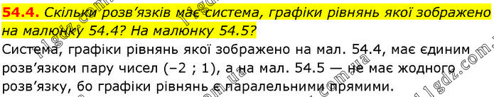 Скільки розв’язків має система, графіки рівнянь якої зображено на малюнку 54.4? На малюнку 54.5? Система, графіки рівнянь якої зображено на мал. 54.4, має єдиним розв’язком пару чисел (–2 ; 1), а на мал. 54.5 — не має жодного розв’язку, бо графіки рівнянь є паралельними прямими.