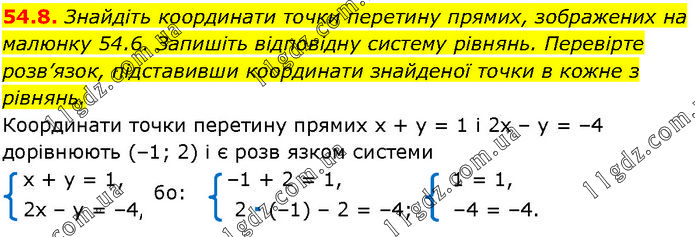 Знайдіть координати точки перетину прямих, зображених на малюнку 54.6. Запишіть відповідну систему рівнянь. Перевірте розв’язок, підставивши координати знайденої точки в кожне з рівнянь. Координати точки перетину прямих х + у = 1 і 2х – у = –4 дорівнюють (–1; 2) і є розв язком системи