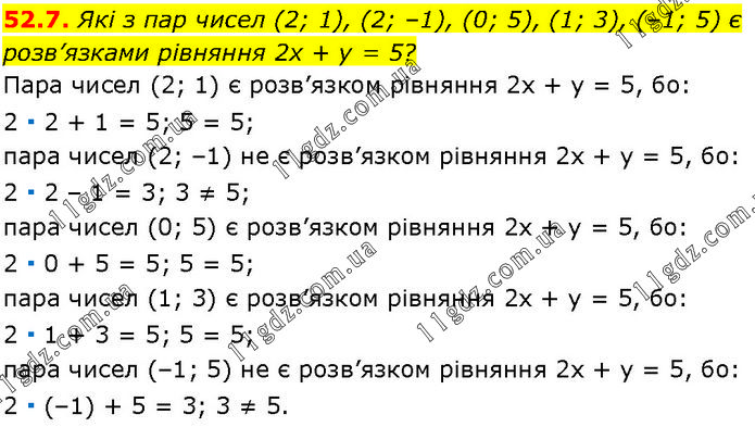 Які з пар чисел (2; 1), (2; –1), (0; 5), (1; 3), (–1; 5) є розв’язками рівняння 2х + у = 5? Пара чисел (2; 1) є розв’язком рівняння 2х + у = 5, бо: 2 ∙ 2 + 1 = 5; 5 = 5; пара чисел (2; –1) не є розв’язком рівняння 2х + у = 5, бо: 2 ∙ 2 – 1 = 3; 3 ≠ 5; пара чисел (0; 5) є розв’язком рівняння 2х + у = 5, бо: 2 ∙ 0 + 5 = 5; 5 = 5; пара чисел (1; 3) є розв’язком рівняння 2х + у = 5, бо: 2 ∙ 1 + 3 = 5; 5 = 5; пара чисел (–1; 5) не є розв’язком рівняння 2х + у = 5, бо: 2 ∙ (–1) + 5 = 3; 3 ≠ 5.