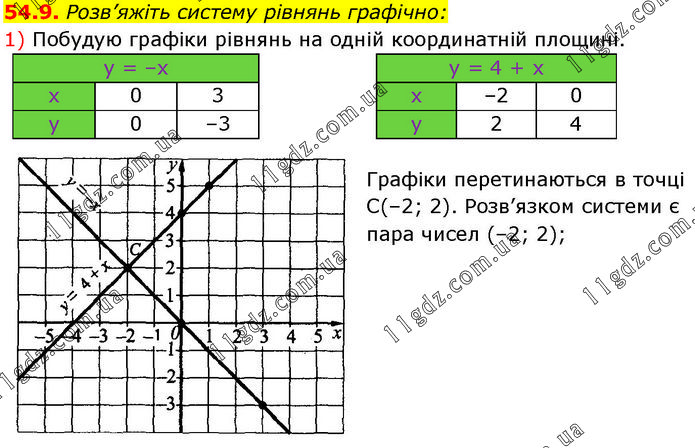Розв’яжіть систему рівнянь графічно: 1) Побудую графіки рівнянь на одній координатній площині. Графіки перетинаються в точці С(–2; 2). Розв’язком системи є пара чисел (–2; 2);