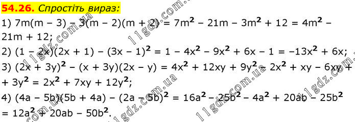 Спростіть вираз: 1) 7m(m – 3) – 3(m – 2)(m + 2) = 7m2 – 21m – 3m2 + 12 = 4m2 – 21m + 12; 2) (1 – 2х)(2x + 1) – (Зx – 1)2 = 1 – 4х2 – 9х2 + 6х – 1 = –13x2 + 6х; 3) (2х + 3у)2 – (х + Зу)(2х – у) = 4х2 + 12ху + 9у2 – 2х2 + ху – 6ху + Зу2 = 2х2 + 7xy + 12у2; 4) (4а – 5b)(5b + 4а) – (2а – 5b)2 = 16а2 – 25b2 – 4а2 + 20аb – 25b2 = 12а2 + 20ab – 50b2.