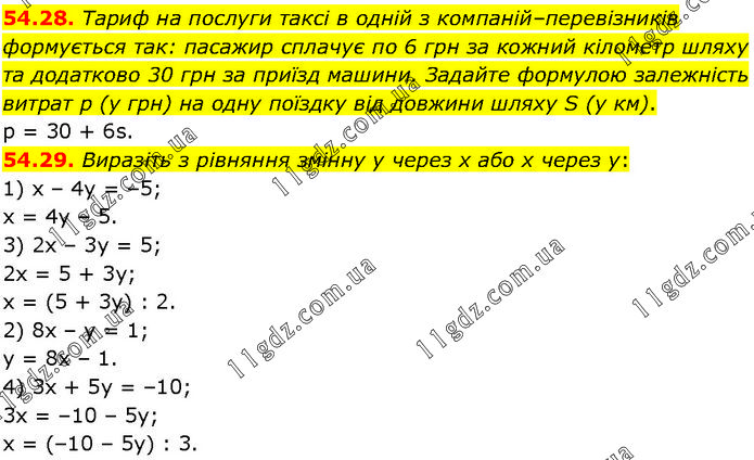54.28. Тариф на послуги таксі в одній з компаній–перевізників формується так: пасажир сплачує по 6 грн за кожний кілометр шляху та додатково 30 грн за приїзд машини. Задайте формулою залежність витрат р (у грн) на одну поїздку від довжини шляху S (у км). р = 30 + 6s. 54.29. Виразіть з рівняння змінну у через х або х через у: 1) х – 4у = –5; х = 4у – 5. 3) 2х – 3y = 5; 2х = 5 + 3у; х = (5 + 3у) : 2. 2) 8х – у = 1; у = 8х – 1. 4) 3x + 5у = –10; 3х = –10 – 5у; х = (–10 – 5у) : 3.