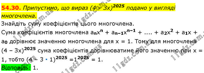 Припустимо, що вираз (4 – Зх)2025 подано у вигляді многочлена. Знайдіть суму коефіцієнтів цього многочлена. Сума коефіцієнтів многочлена аnxn + an–1xn–1 + .... + а2х2 + а1х + а0 дорівнює значенню многочлена для х = 1. Тому для многочлена (4 – Зх)2025 сума коефіцієнтів дорівнюватиме його значенню при х = 1, тобто (4 – 3 ∙ 1)2025 = 12025 = 1. Відповідь: 1.