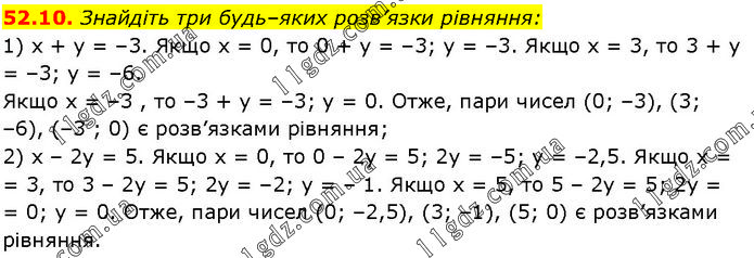 Знайдіть три будь–яких розв’язки рівняння: 1) х + у = –3. Якщо х = 0, то 0 + у = –3; у = –3. Якщо x = 3, то 3 + у = –3; у = –6. Якщо х = –3 , то –3 + у = –3; у = 0. Отже, пари чисел (0; –3), (3; –6), (–3 ; 0) є розв’язками рівняння; 2) х – 2у = 5. Якщо х = 0, то 0 – 2у = 5; 2у = –5; у = –2,5. Якщо х = 3, то 3 – 2у = 5; 2у = –2; у = – 1. Якщо х = 5, то 5 – 2у = 5; 2у = 0; у = 0. Отже, пари чисел (0; –2,5), (3; –1), (5; 0) є розв’язками рівняння.