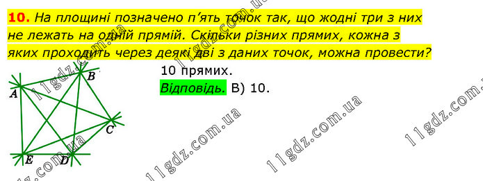 На площині позначено п’ять точок так, що жодні три з них не лежать на одній прямій. Скільки різних прямих, кожна з яких проходить через деякі дві з даних точок, можна провести? 10 прямих. Відповідь. В) 10.