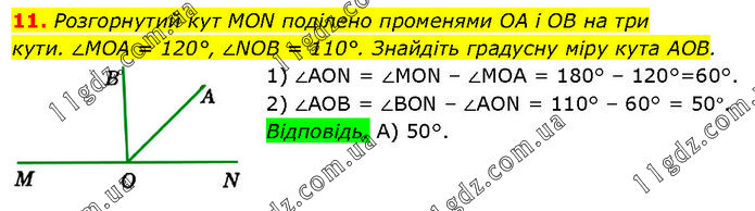 Розгорнутий кут MON поділено променями OA і OB на три кути. ∠MOA = 120°, ∠NOB = 110°. Знайдіть градусну міру кута AOB. 1) ∠AON = ∠MON – ∠MOA = 180° – 120°=60°. 2) ∠AOB = ∠BON – ∠AON = 110° – 60° = 50°. Відповідь. А) 50°.