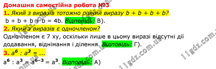 Домашня самостійна робота №3 1. Який з виразів тотожно рівний виразу b + b + b + b? b + b + b + b = 4b. Відповідь: В). 2. Який з виразів є одночленом? Одночленом є 7 ху, оскільки лише в цьому виразі відсутні дії додавання, віднімання і ділення. Відповідь: Г). 3. а6 : а3 = ... а6 : а3 = а6–3 = а3. Відповідь: А)