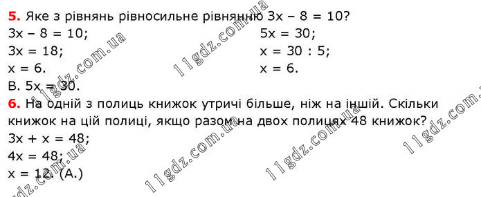 5. Яке з рівнянь рівносильне рівнянню Зх – 8 = 10? 3х – 8 = 10; 3х = 18; х = 6. 5х = 30; х = 30 : 5; х = 6. В. 5х = 30. 6. На одній з полиць книжок утричі більше, ніж на іншій. Скільки книжок на цій полиці, якщо разом на двох полицях 48 книжок? 3х + х = 48; 4х = 48; х = 12. (А.)