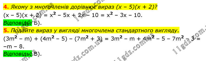 4. Якому з многочленів дорівнює вираз (x – 5)(х + 2)? (х – 5)(х + 2) = x2 – 5х + 2x – 10 = x2 – 3х – 10. Відповідь: Б). 5. Подайте вираз у вигляді многочлена стандартного вигляду. (3m2 – m) + (4m2 – 5) – (7m2 + 3) = 3m2 – m + 4m2 – 5 – 7m2 – 3 = –m – 8. Відповідь: В).
