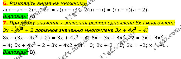 6. Розкладіть вираз на множники. аm – аn – 2m + 2n = а(m – n) – 2(m – n) = (m – n)(а – 2). Відповідь: А). 7. При якому значенні х значення різниці одночлена 8х і многочлена Зx – 4x2 + 2 дорівнює значенню многочлена Зx + 4х2 – 4? 8х – (3х – 4x2 + 2) = 3х + 4х2 – 4; 8х – 3х + 4х2 – 2 = 3х + 4х2 – – 4; 5х + 4х2 – 2 – 3х – 4x2 + 4 = 0; 2x + 2 = 0; 2x = –2; x = –1 . Відповідь: В).