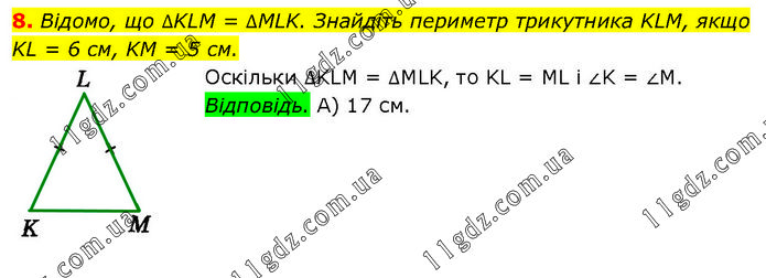 8. Відомо, що ∆KLM = ∆MLK. Знайдіть периметр трикутника KLM, якщо KL = 6 см, KM = 5 см. Оскільки ∆KLM = ∆MLK, то KL = ML і ∠K = ∠M. Відповідь. А) 17 см.