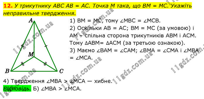 У трикутнику ABC AB = АС. Точка M така, що BM = MC. Укажіть неправильне твердження. 1) BM = MC, тому ∠MBC = ∠MCB. 2) Оскільки AB = AC; BM = MC (за умовою) і AM – спільна сторона трикутників ABM і ACM. Тому ∆ABM= ∆ACM (за третьою ознакою). 3) Маємо ∠BAM = ∠САМ; ∠BMA = ∠CMA і ∠MBA = ∠MCA. 4) Твердження ∠MBA > ∠MCA — хибне. Відповідь. Б) ∠MBA > ∠MCA.