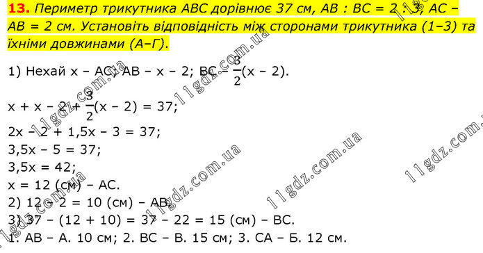 Периметр трикутника ABC дорівнює 37 см, AB : BC = 2 : 3, AC – AB = 2 см. Установіть відповідність між сторонами трикутника (1–3) та їхніми довжинами (А–Г). 1) Нехай х – АС; АВ – х – 2; ВС – 3/2(х – 2). х + х – 2 + 3/2(х – 2) = 37; 2х – 2 + 1,5х – 3 = 37; 3,5х – 5 = 37; 3,5х = 42; х = 12 (см) – АС. 2) 12 – 2 = 10 (см) – АВ. 3) 37 – (12 + 10) = 37 – 22 = 15 (см) – ВС. 1. АВ – А. 10 см; 2. ВС – В. 15 см; 3. СА – Б. 12 см.