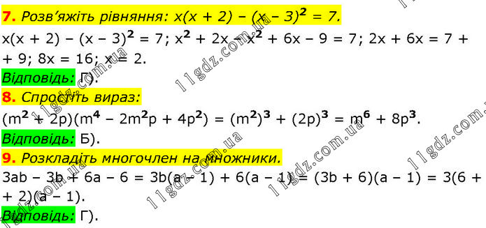 7. Розв’яжіть рівняння: х(х + 2) – (х – З)2 = 7. х(х + 2) – (х – 3)2 = 7; x2 + 2х – x2 + 6х – 9 = 7; 2х + 6х = 7 + 9; 8х = 16; х = 2. Відповідь: Г). 8. Спростіть вираз: (m2 + 2р)(m4 – 2m2р + 4p2) = (m2)3 + (2р)3 = m6 + 8p3. Відповідь: Б). 9. Розкладіть многочлен на множники. 3аb – 3b + 6а – 6 = 3b(а – 1) + 6(а – 1) = (3b + 6)(а – 1) = 3(6 + 2)(а – 1). Відповідь: Г).
