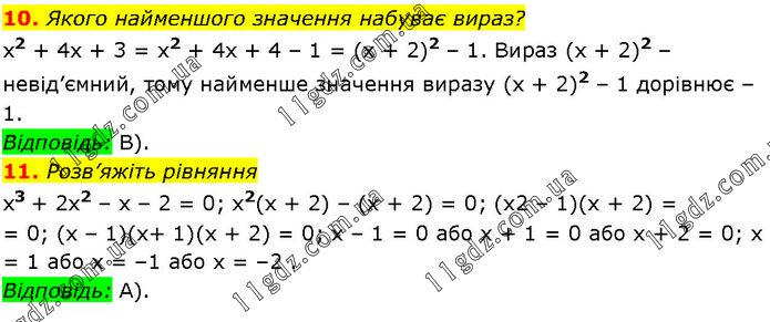 10. Якого найменшого значення набуває вираз? x2 + 4х + 3 = x2 + 4х + 4 – 1 = (х + 2)2 – 1. Вираз (х + 2)2 – невід’ємний, тому найменше значення виразу (х + 2)2 – 1 дорівнює –1. Відповідь: В). 11. Розв’яжіть рівняння x3 + 2х2 – х – 2 = 0; x2(х + 2) – (х + 2) = 0; (x2 – 1)(х + 2) = 0; (х – 1)(х + 1)(х + 2) = 0; х – 1 = 0 або х + 1 = 0 або х + 2 = 0; х = 1 або х = –1 або х = –2. Відповідь: А).