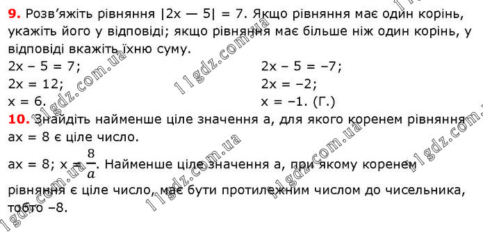 9. Розв’яжіть рівняння |2х — 5| = 7. Якщо рівняння має один корінь, укажіть його у відповіді; якщо рівняння має більше ніж один корінь, у відповіді вкажіть їхню суму. 2х – 5 = 7; 2х = 12; х = 6. 2х – 5 = –7; 2х = –2; х = –1. (Г.) 10. Знайдіть найменше ціле значення а, для якого коренем рівняння ах = 8 є ціле число. ах = 8; х = 8/a. Найменше ціле значення а, при якому коренем рівняння є ціле число, має бути протилежним числом до чисельника, тобто –8.