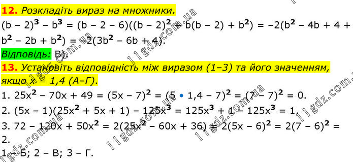 12. Розкладіть вираз на множники. (b – 2)3 – b3 = (b – 2 – 6)((b – 2)2 + b(b – 2) + b2) = –2(b2 – 4b + 4 + b2 – 2b + b2) = –2(3b2 – 6b + 4). Відповідь: В). 13. Установіть відповідність між виразом (1–3) та його значенням, якщо х = 1,4 (А–Г). 1. 25х2 – 70х + 49 = (5х – 7)2 = (5 • 1,4 – 7)2 = (7 – 7)2 = 0. 2. (5х – 1)(25х2 + 5х + 1) – 125х3 = 125х3 + 1 – 125х3 = 1. 3. 72 – 120х + 50х2 = 2(25х2 – 60х + 36) = 2(5х – 6)2 = 2(7 – 6)2 = 2. 1 – Б; 2 – В; 3 – Г.