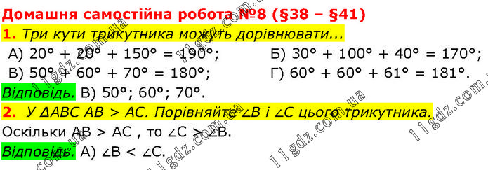 Домашня самостійна робота №8 (§38 – §41) 1. Три кути трикутника можуть дорівнювати... А) 20° + 20° + 150° = 190°; В) 50° + 60° + 70° = 180°; Б) 30° + 100° + 40° = 170°; Г) 60° + 60° + 61° = 181°. Відповідь. В) 50°; 60°; 70°. 2. У ΔABC AB > АС. Порівняйте ∠B і ∠C цього трикутника. Оскільки AB > АС , то ∠C > ∠B. Відповідь. A) ∠B < ∠C.