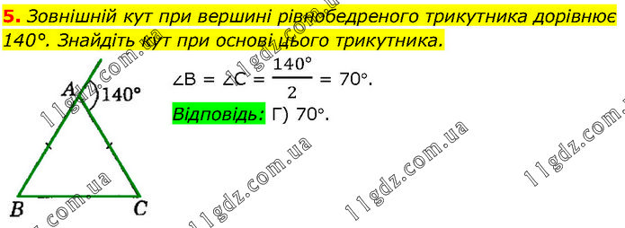 Зовнішній кут при вершині рівнобедреного трикутника дорівнює 140°. Знайдіть кут при основі цього трикутника. ∠В = ∠С = (140°)/2 = 70°. Відповідь: Г) 70°.