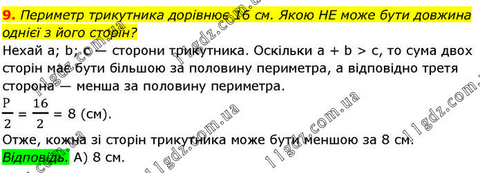 Периметр трикутника дорівнює 16 см. Якою НЕ може бути довжина однієї з його сторін? Нехай а; b; с — сторони трикутника. Оскільки a + b > с, то сума двох сторін має бути більшою за половину периметра, а відповідно третя сторона — менша за половину периметра. (Р )/2 = 16/2 = 8 (см). Отже, кожна зі сторін трикутника може бути меншою за 8 см. Відповідь. А) 8 см.