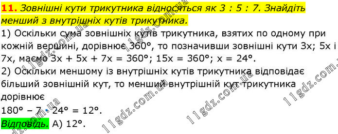 Зовнішні кути трикутника відносяться як 3 : 5 : 7. Знайдіть менший з внутрішніх кутів трикутника. 1) Оскільки сума зовнішніх кутів трикутника, взятих по одному при кожній вершині, дорівнює 360°, то позначивши зовнішні кути Зх; 5х і 7х, маємо Зх + 5х + 7х = 360°; 15х = 360°; х = 24°. 2) Оскільки меншому із внутрішніх кутів трикутника відповідає більший зовнішній кут, то менший внутрішній кут трикутника дорівнює 180° – 7 ∙ 24° = 12°. Відповідь. А) 12°.