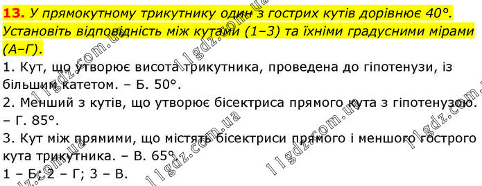 У прямокутному трикутнику один з гострих кутів дорівнює 40°. Установіть відповідність між кутами (1–3) та їхніми градусними мірами (А–Г). 1. Кут, що утворює висота трикутника, проведена до гіпотенузи, із більшим катетом. – Б. 50°. 2. Менший з кутів, що утворює бісектриса прямого кута з гіпотенузою. – Г. 85°. 3. Кут між прямими, що містять бісектриси прямого і меншого гострого кута трикутника. – В. 65°. 1 – Б; 2 – Г; 3 – В.