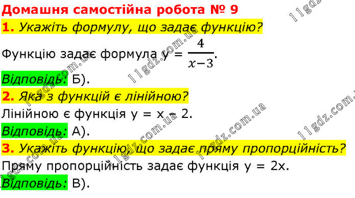 Домашня самостійна робота № 9 1. Укажіть формулу, що задає функцію? Функцію задає формула у = 4/(x-3). Відповідь: Б). 2. Яка з функцій є лінійною? Лінійною є функція у = х – 2. Відповідь: А). 3. Укажіть функцію, що задає пряму пропорційність? Пряму пропорційність задає функція y = 2х. Відповідь: В).